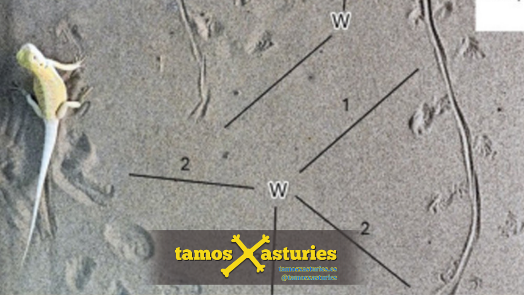 El rastro T1, con siete huellas, corresponde a un lagarto de unos 50 centímetros de longitud, mientras que el T2, con seis marcas, pertenecería a un ejemplar más pequeño, de unos 30 centímetros. En el primero se ha identificado incluso la marca continua de la cola, un detalle excepcional que aporta información valiosa sobre su desplazamiento.
